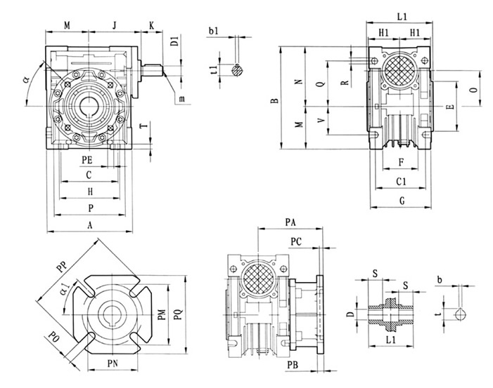 | 型號 | Q | R | S | T | V | PE | b | b1 | t | t1 | m | α | Kg. |