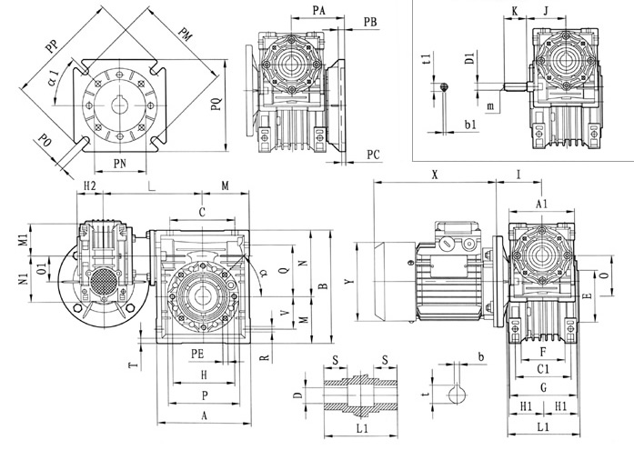 | 型號 | N1 | O | 01 | P | Q | R | S | T | V | PE | α | b | b1 | t | t1 | m | Kg |